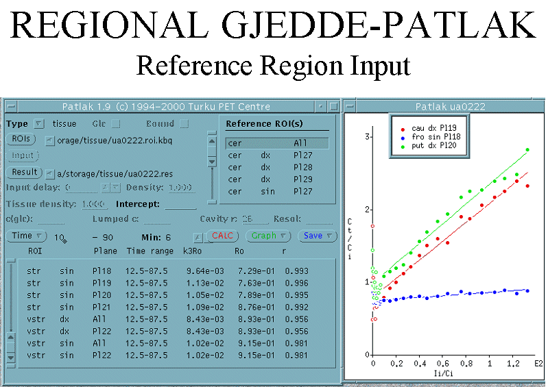 Note that although it is possible to do Gjedde-Patlak analysis with plasma input from late-scan imaging only, that is not possible with reference tissue input! For MTGA methods the input data must always be measured starting from the time of tracer injection.