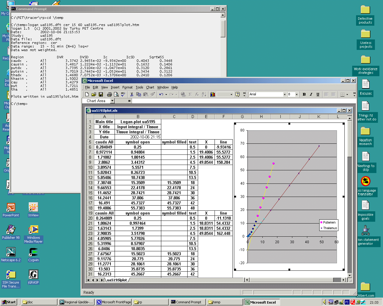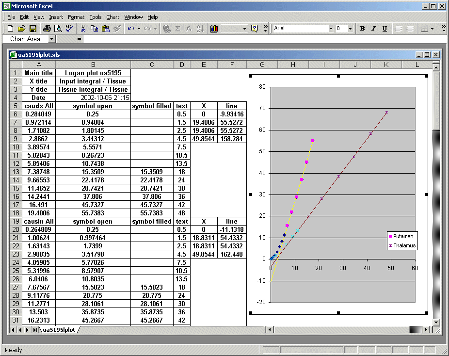 Below is a screen capture of a Logan plot analysis of a raclopride study on PC / MS Windows 2000 and Excel 2000.