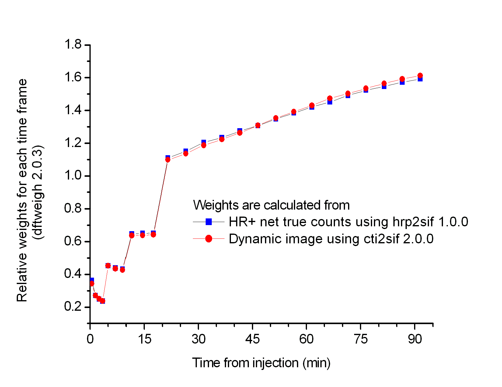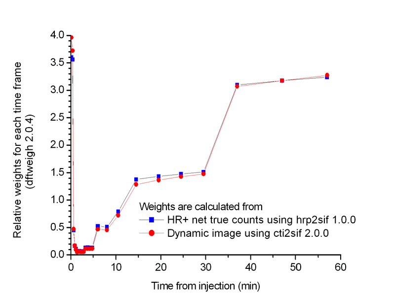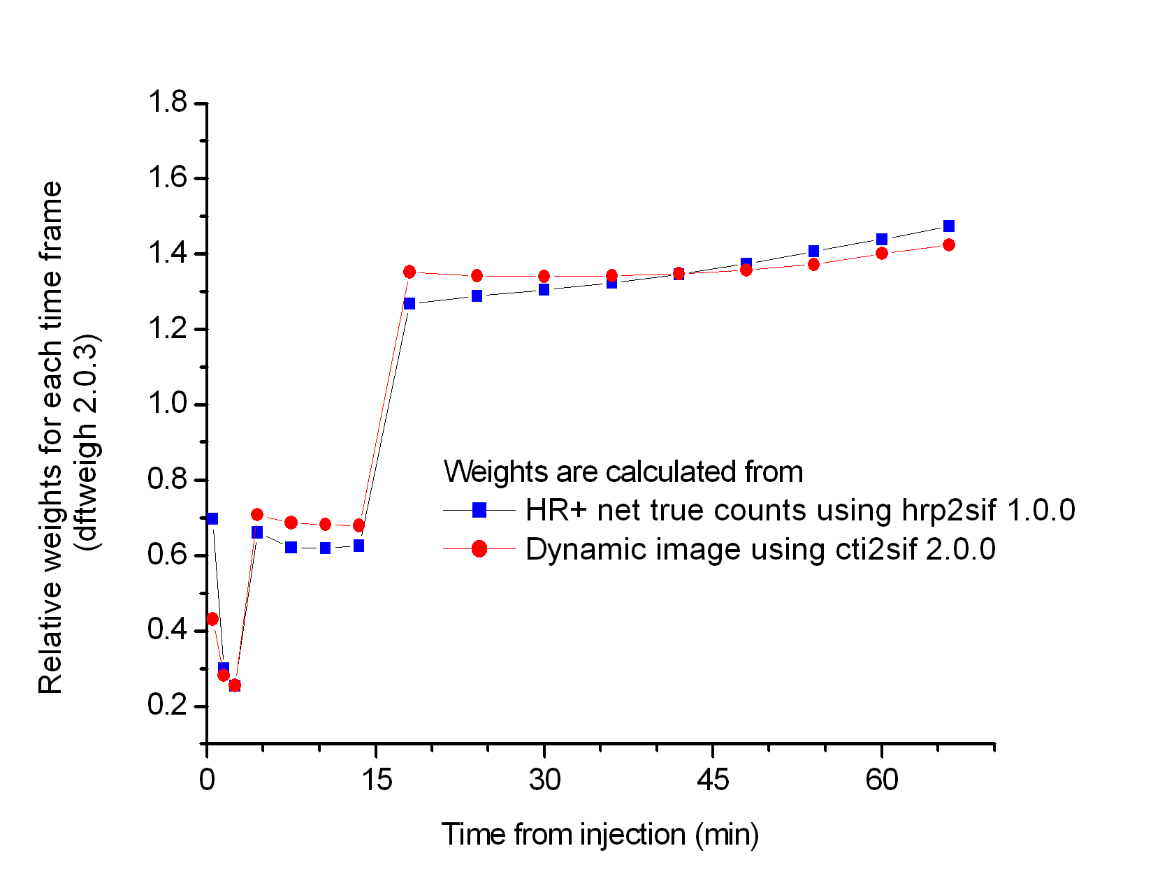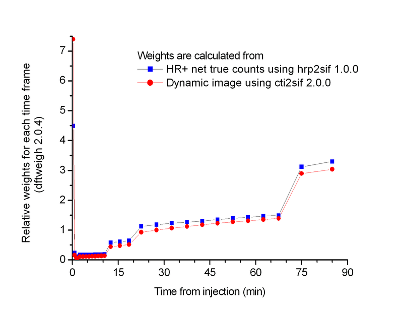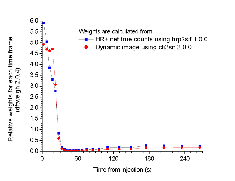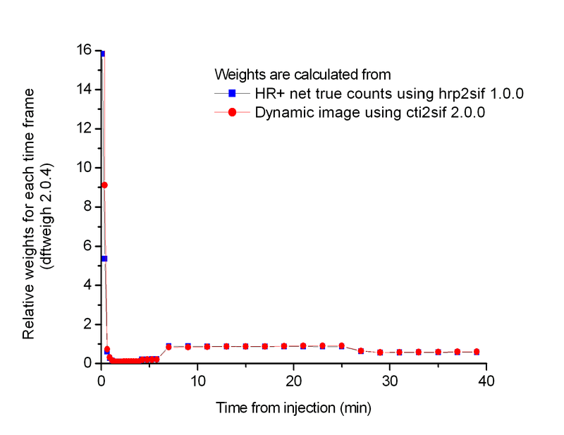If SIF data is not available, for most purposes it is enough to produce it from dynamic ECAT 6.3 or ECAT 7 images using eframe or cti2sif. As examples, below are graphs of fit weight factors calculated from net true counts and from average radioactivity concentration in the dynamic image: