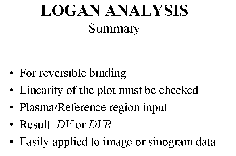 The linear models developed by Logan et al. [Logan 2000] have become a standard calculation method for receptor-ligand studies, like the Gjedde-Patlak plot has been in the metabolism studies. Logan plots are used to calculate the distribution volume of ligand tracers that have a reversible binding kinetics. If a receptor-free region exists, a distribution volume ratio can be calculated.