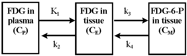 Reduced and workable compartmental model for FDG kinetics in brain tissue.